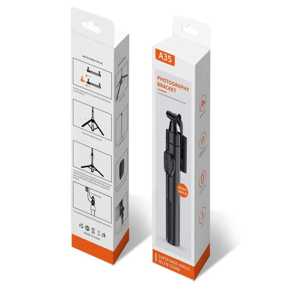 Штатив-трипод Adyss A35 черного цвета с пультом представляет собой удобное устройство для съемки сверх широкоугольных селфи и создания качественных снимков.