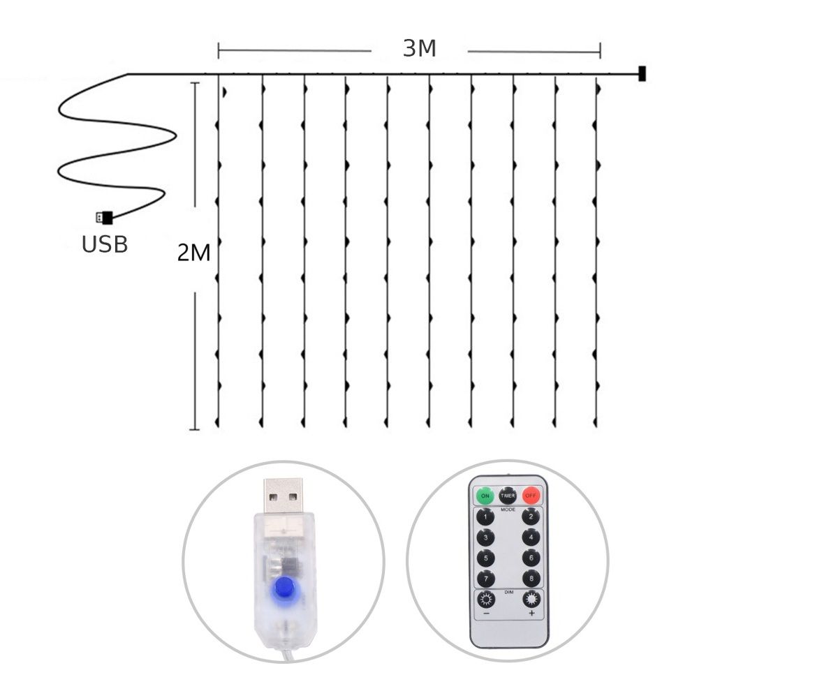 RGB USB светодиодная гирлянда штора, 3x2 м, 8 режимов, пульт ДУ, БЕЗ КРЮЧКОВ