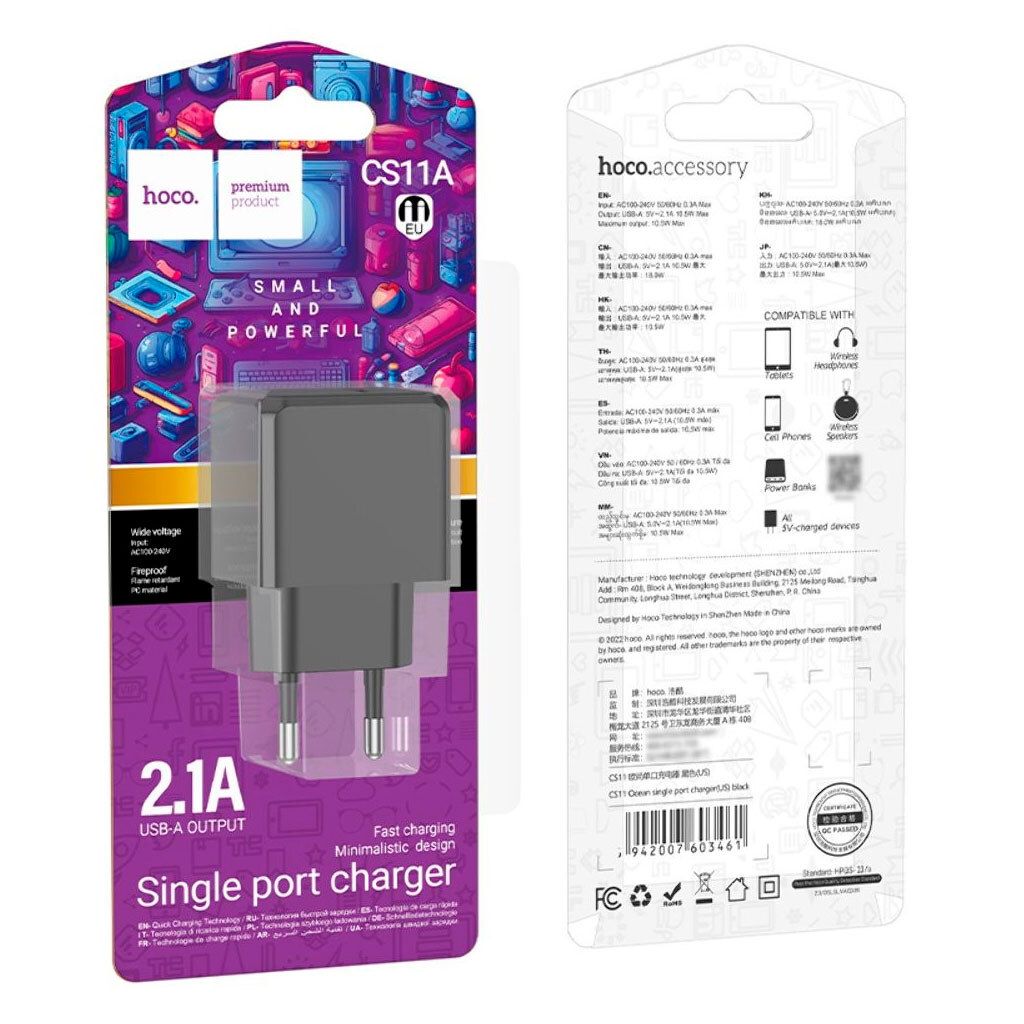 Hoco CS11A – это надежный сетевой адаптер, предназначенный для безопасной зарядки смартфонов, планшетов, гарнитур, повербанков и других совместимых гаджетов. Устройство выделяется минималистичным дизайном со скошенными гранями и текстурированной поверхностью, а также компактными размерами, что делает его удобным для ежедневного использования дома и в поездках.