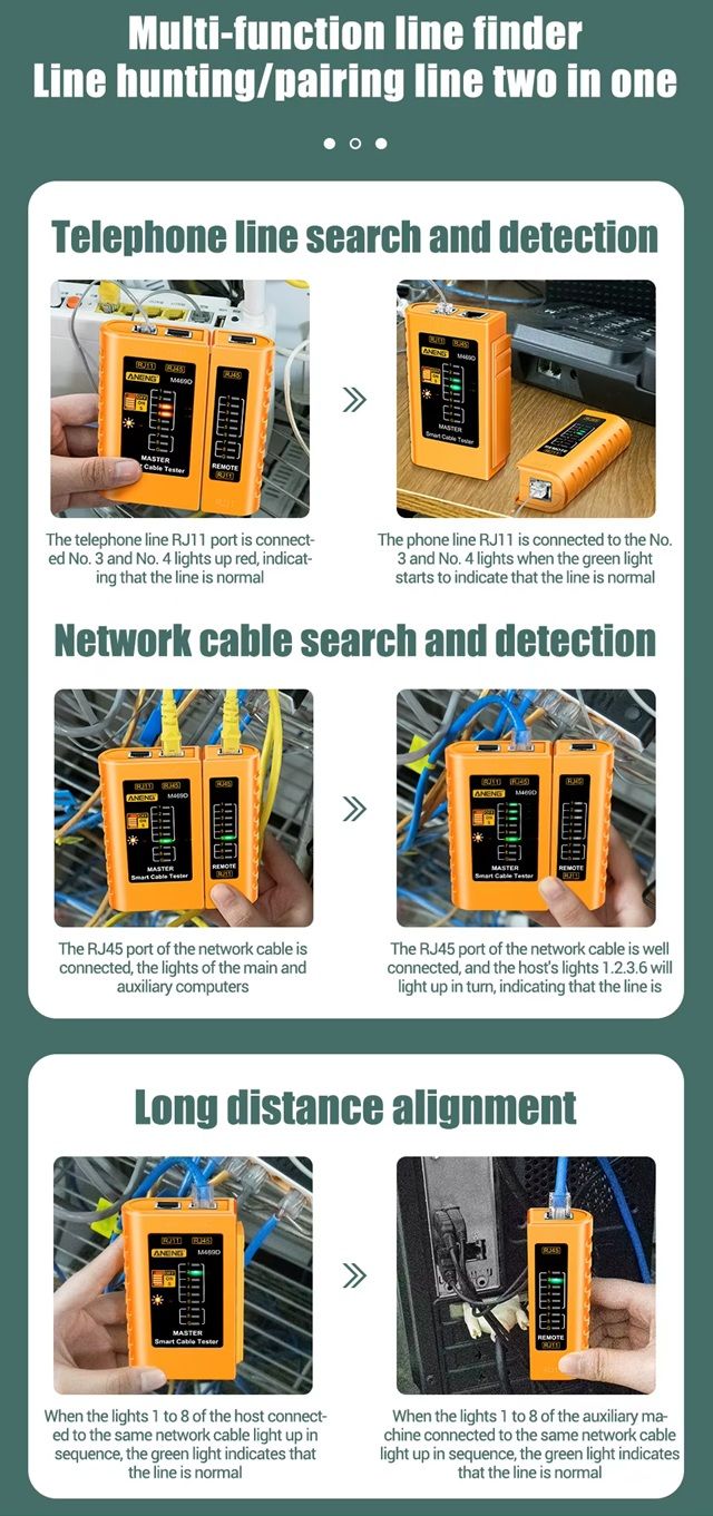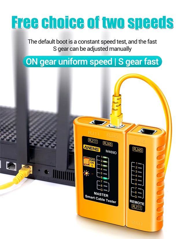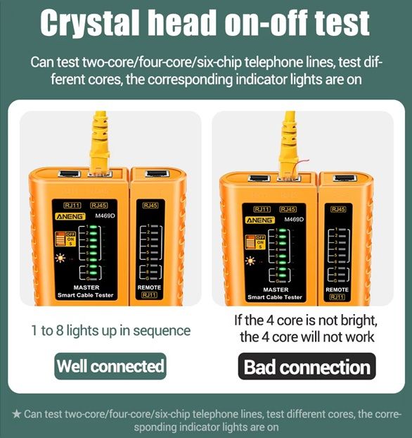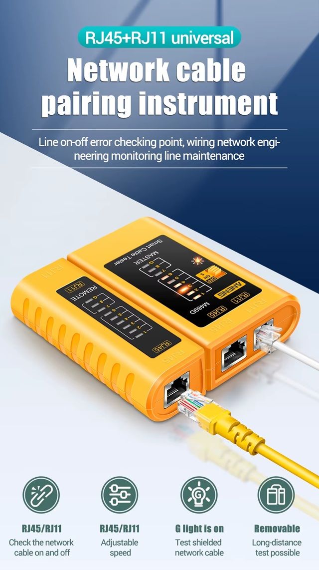 ANENG M469D – это универсальный кабельный тестер, предназначенный для проверки целостности и правильности соединений сетевых и телефонных кабелей. Он помогает выявить обрывы, короткие замыкания, а также проверить корректность обжима разъемов RJ45 и RJ11. Благодаря раздельным передающей и приемной частям устройство позволяет тестировать кабели как локально, так и удаленно.