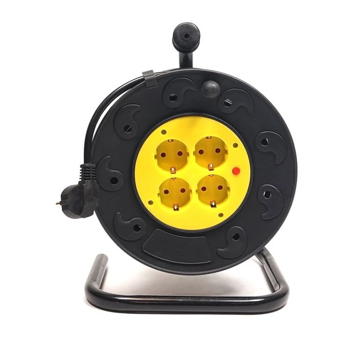 Удлинитель имеет 4 розетки евростандарта с заземлением, что обеспечивает безопасность подключения различных приборов. Корпус выполнен из огнеупорного пластика, а конструкция катушки оснащена удобной рукояткой для транспортировки. Во время работы неиспользованный кабель остаётся в смотанном виде, что значительно упрощает эксплуатацию и хранение.