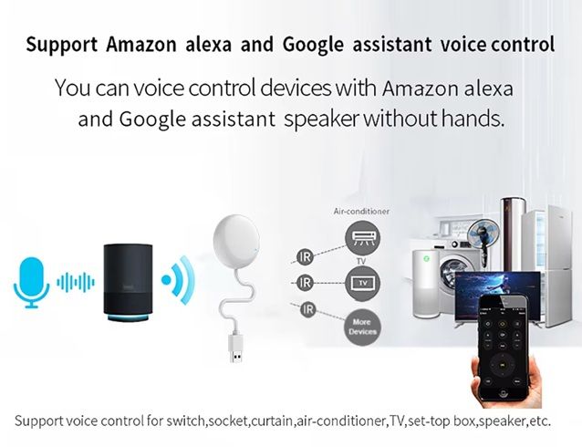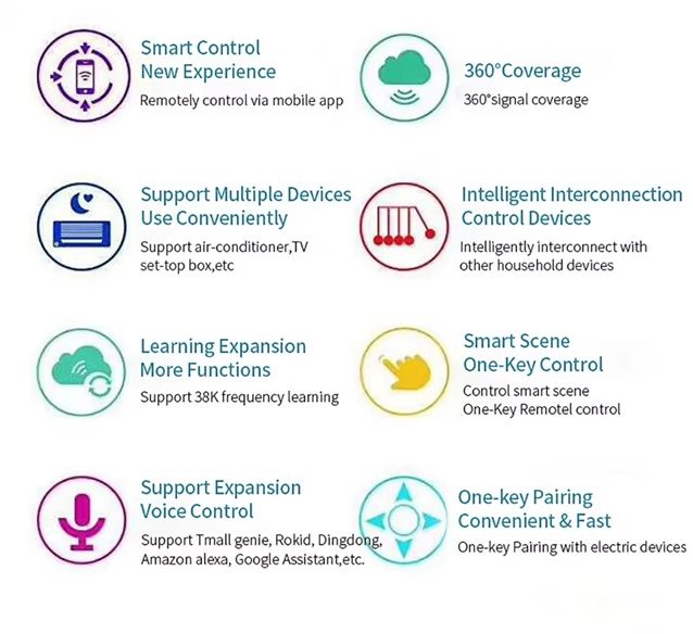 Это идеальный помощник для управления бытовой техникой. Он заменяет множество традиционных пультов, предоставляя удобное управление через смартфон или голосовых ассистентов Amazon Alexa и Google Home и позволяет контролировать телевизоры, кондиционеры, ТВ-приставки, вентиляторы и другие устройства с инфракрасным управлением. Совместимость с более чем 4000 брендами и поддержка 50000+ кодов ИК-управления делает этот пульт универсальным. Благодаря сопряжению с приложением Smart Life или Tuya Smart, вы можете управлять техникой из любой точки мира, а простая настройка, широкий функционал и возможность автоматизации делают этот пульт отличным выбором для умного дома!