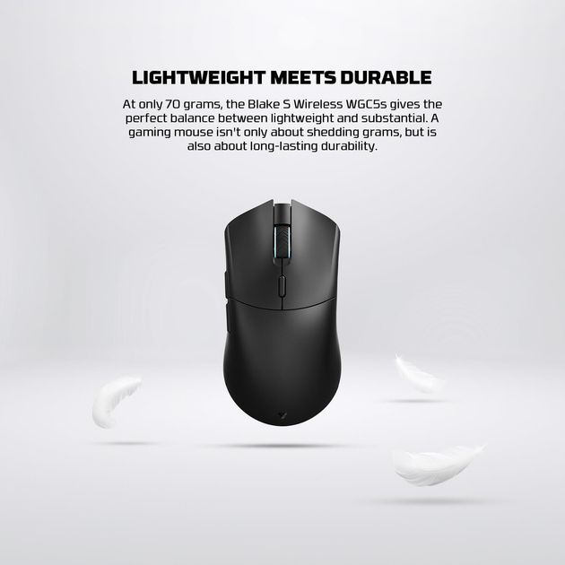 - Мышь имеет симметричную форму, что делает ее удобной для использования как правой, так и левой рукой. Легкость (всего 70 г) и компактные размеры обеспечивают комфорт даже в длительных игровых сессиях.