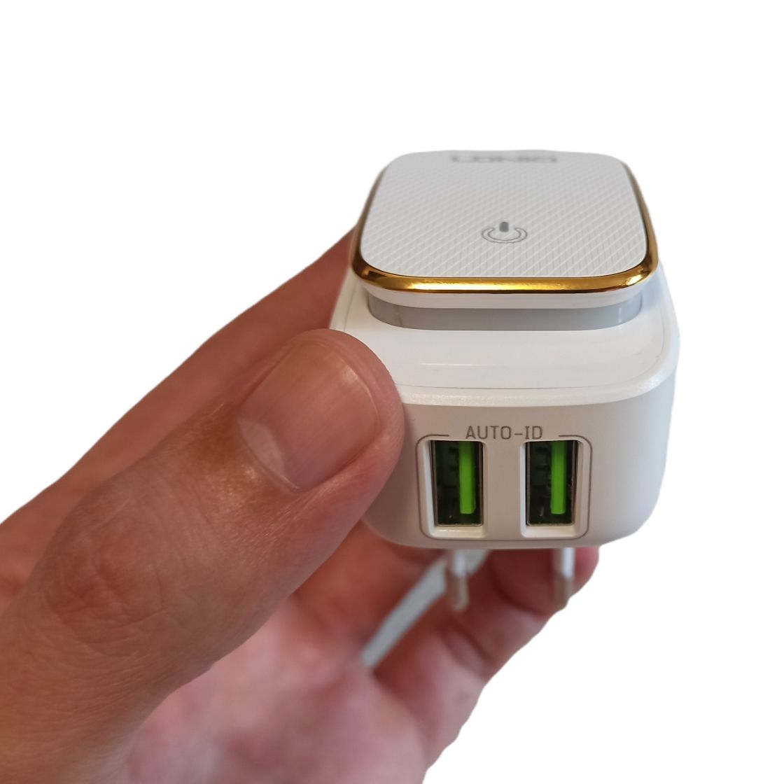 Мережевий адаптер LDNIO A2205 Touch Light - це не просто зарядний пристрій, а стильний і функціональний аксесуар, що поєднує в собі надійне заряджання і м'яке світлодіодне підсвічування, яке можна використовувати як нічник. Пристрій оснащений двома USB-портами і дозволяє одночасно заряджати два гаджети - смартфони, планшети, розумний годинник, повербанки, портативні колонки та інші пристрої з USB-живленням.