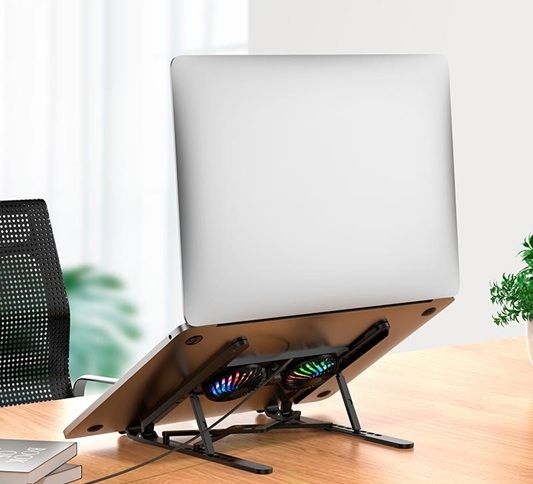 - Підставка виготовлена із зносостійкого пластику та оснащена силіконовими накладками, що запобігають ковзанню ноутбука. Міцні фіксатори утримують пристрій у вибраному положенні навіть під час набору тексту або під час активної роботи.