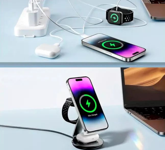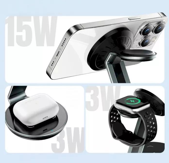 ESSAGER EWXCX3 – це стильний та універсальний бездротовий зарядний пристрій, здатний одночасно заряджати смартфон, бездротові навушники та смарт-годинник. Завдяки вбудованому магнітному кріпленню, він також виконує функцію підставки для телефону, забезпечуючи комфорт у використанні як вдома, так і в офісі.