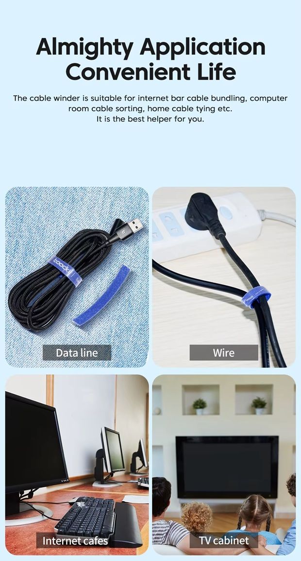 - Липучка надійно фіксується і за необхідності легко знімається та використовується повторно. Не залишає слідів та не пошкоджує кабелі.