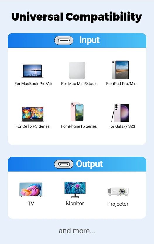 - Підходить для ноутбуків, смартфонів та планшетів з портом Type-C 3.1 та вище, включаючи MacBook Pro/Air, iPad Pro, iPhone 15/16, Samsung Galaxy S24/S23, Dell XPS та інші.