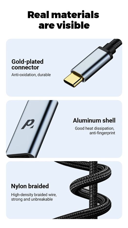 - Алюмінієвий корпус і обплетення із щільного нейлону забезпечують довговічність, стійкість до перегинів та відмінну тепловіддачу.