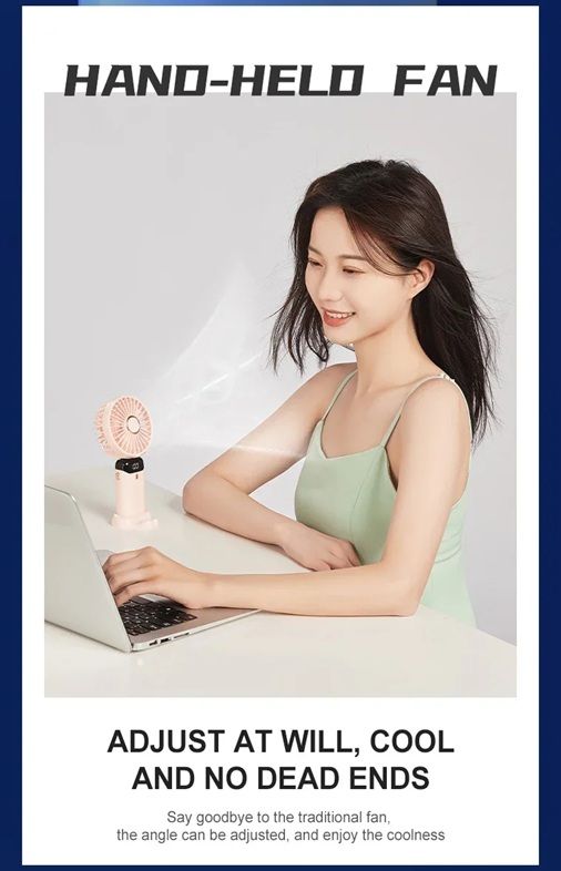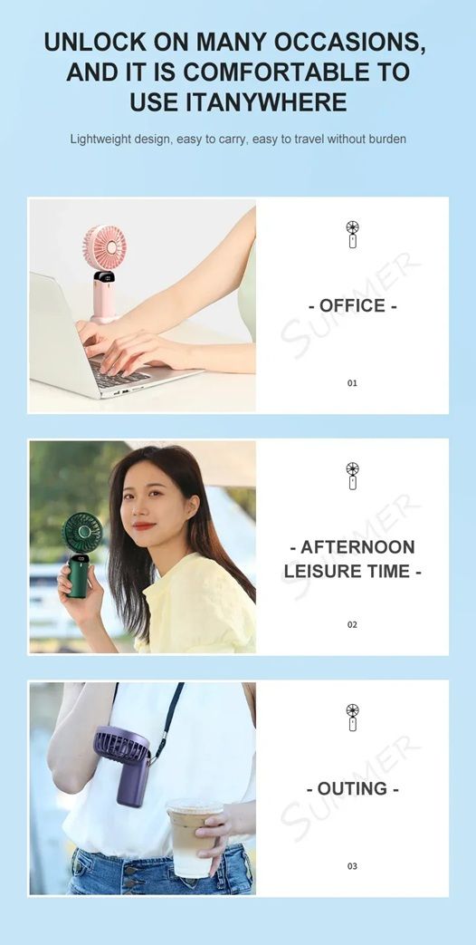 - Пристрій можна тримати в руці, встановити на стіл або повісити на шию за допомогою стрічки — це робить використання цього вентилятора максимально гнучким і зручним.