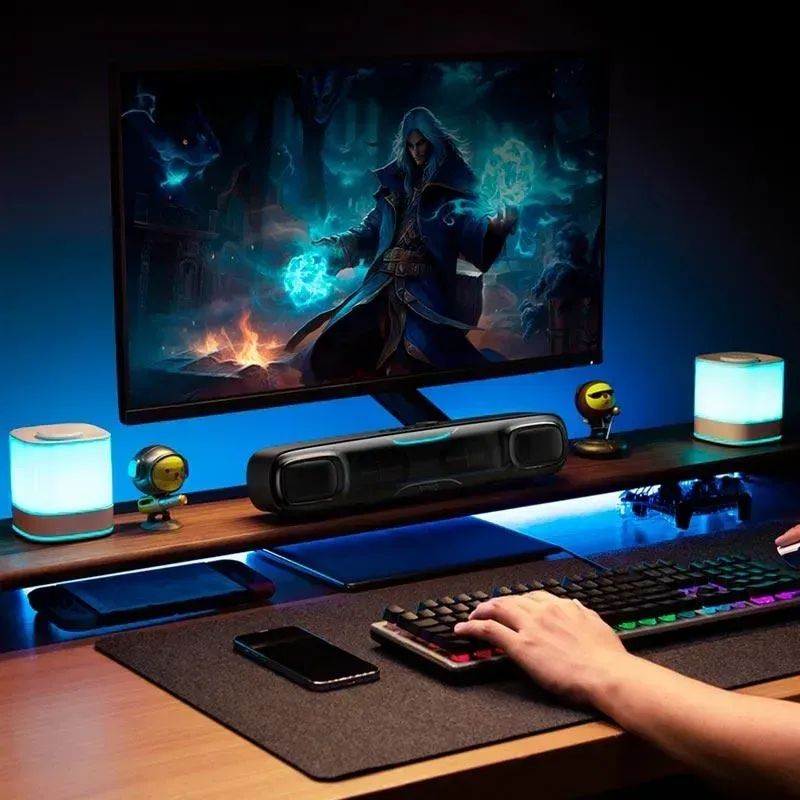 Це компактна і потужна Bluetooth-колонка-саундбар з RGB-підсвічуванням, яка відмінно впишеться в робочий простір, ігрову зону або вітальню. Має вбудований акумулятор, підтримку дротового та бездротового підключення, а також зручне керування через сенсорну панель.