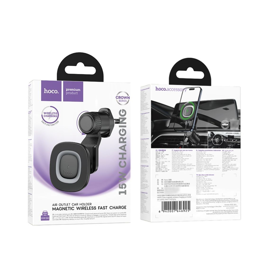 Hoco HW30 – це сучасний автотримач з магнітним кріпленням та підтримкою бездротової зарядки потужністю до 15 Вт. Він поєднує у собі функціональність, ергономічний дизайн та надійну фіксацію смартфона під час поїздок. Ідеально підходить для водіїв, яким важливий зручний доступ до телефону без зайвих дротів.