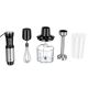 - У комплект входять різноманітні насадки та чаші, які дозволяють використовувати блендер для приготування пюре, подрібнення, збивання та змішування. Це універсальне рішення для різних кулінарних завдань.