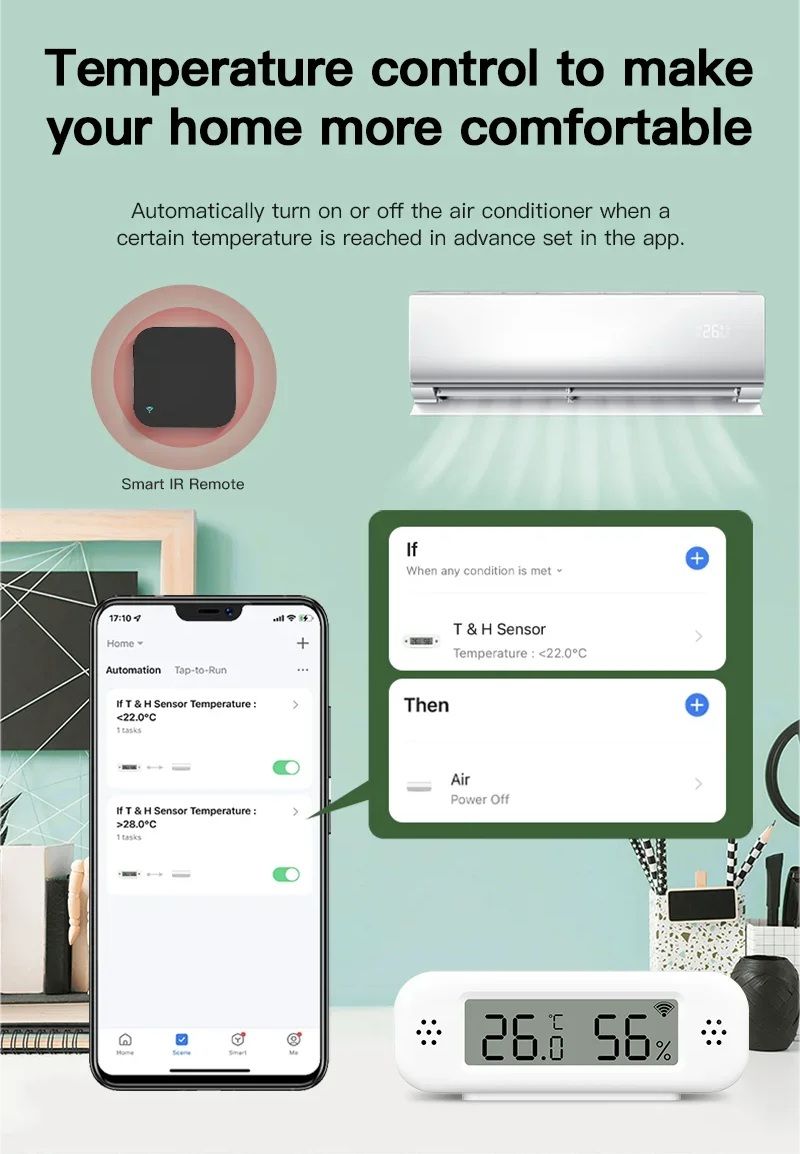 - Інтелектуальна автоматизація: можна встановити сценарії (наприклад, увімкнути кондиціонер при температурі вище 32.6°C або зволожувач при вологості нижче 60%)