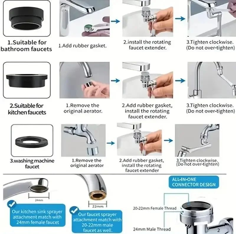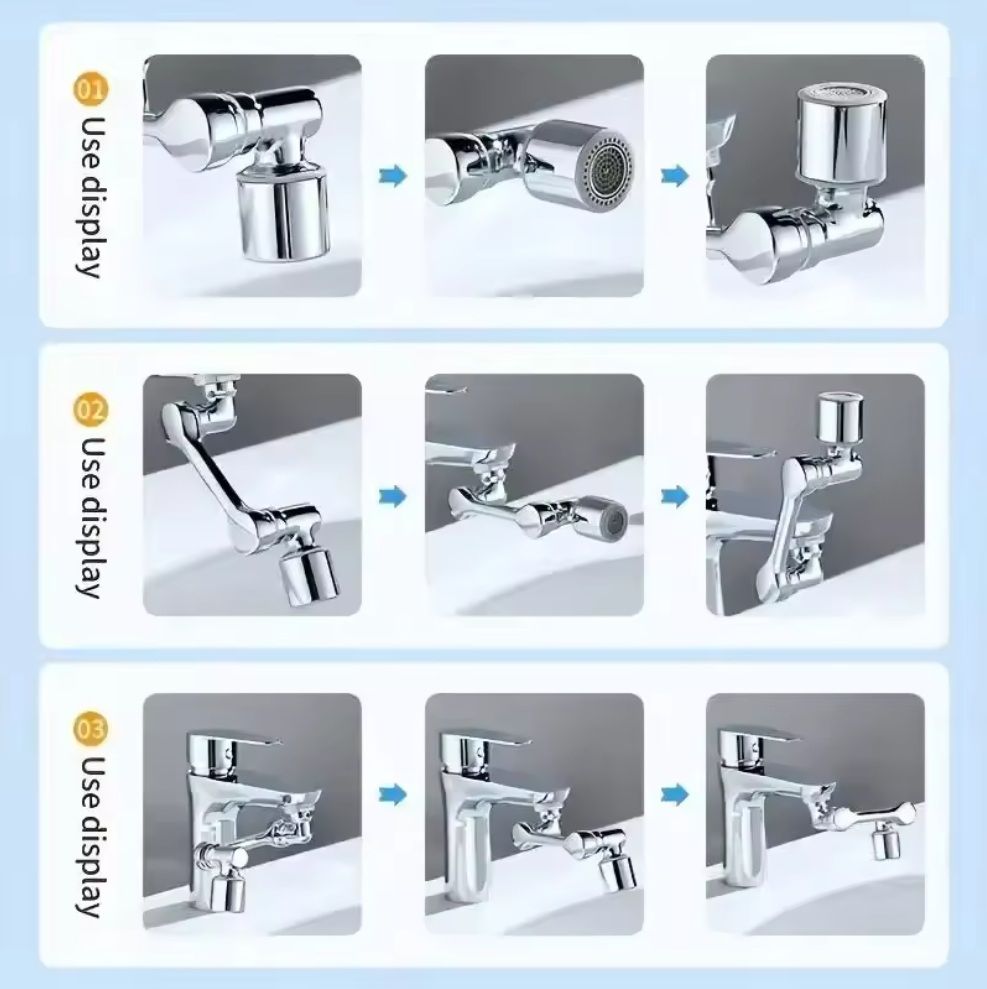 Універсальна насадка-подовжувач "Роборука" - це практичний аксесуар, який забезпечує повний контроль над напрямом потоку води та робить використання води більш зручним та гігієнічним. Завдяки трьом незалежним шарнірам із кутом повороту 360°, загальне обертання становить до 1080°, що робить її ідеальним рішенням для кухні та ванної. Підходить для дому, офісу, дитячих закладів та людей, які дбають про комфорт та чистоту.