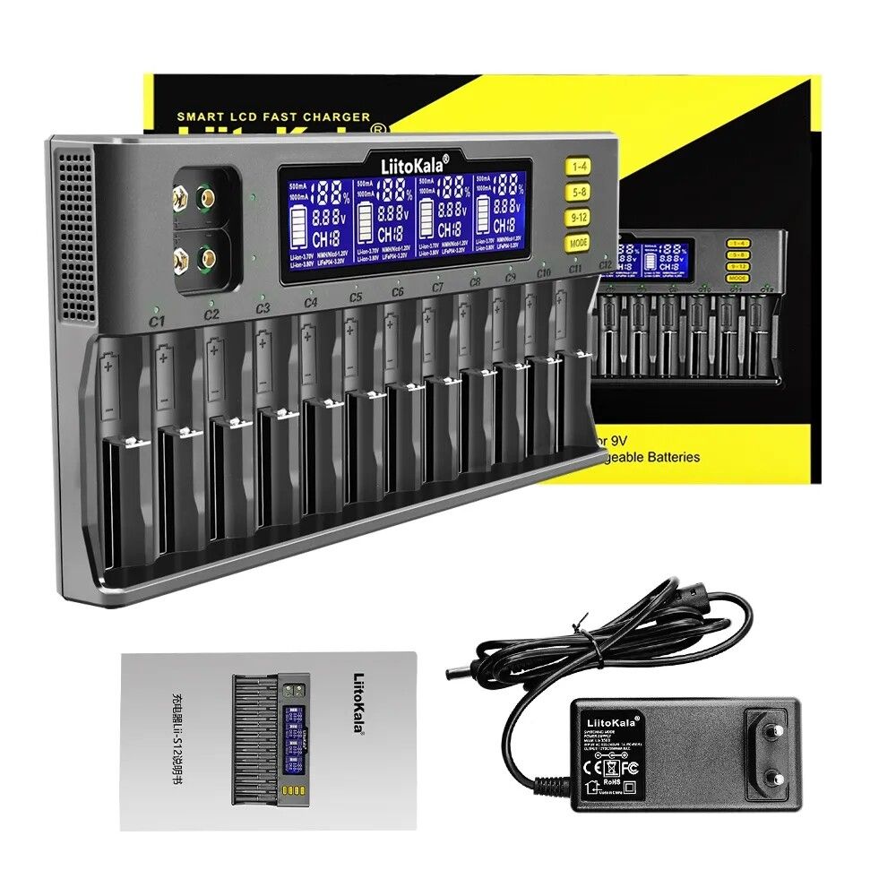 LiitoKala Lii-S12 - це універсальний і інтелектуальний зарядний пристрій з 12 незалежними слотами для циліндричних акумуляторів і 2 слотами для акумуляторів типу "крона" 9В. Відмінно підійде для дому, майстерні, сервісного центру або тих, хто активно працює з акумуляторами.