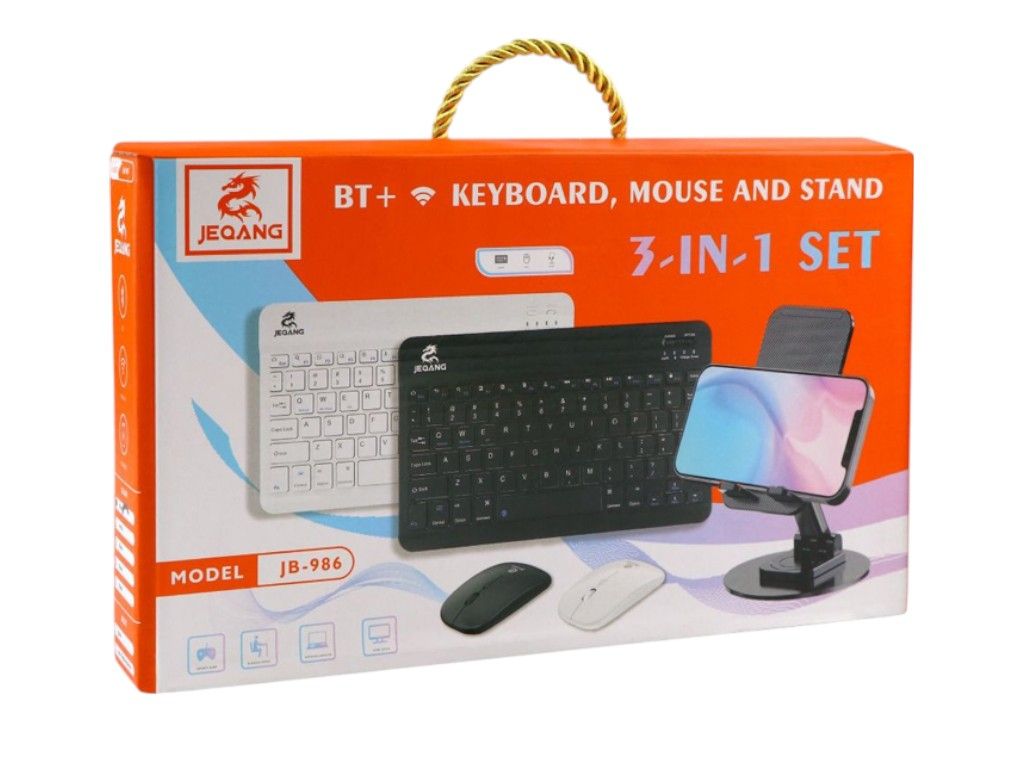 JEQANG JB-986 - це багатофункціональний комплект, що включає бездротову клавіатуру, мишу та універсальний тримач для смартфона. Компактність, надійність та універсальність роблять цей набір чудовим рішенням як для роботи, так і для повсякденного використання з планшетами, смартфонами, комп'ютерами чи Smart TV.