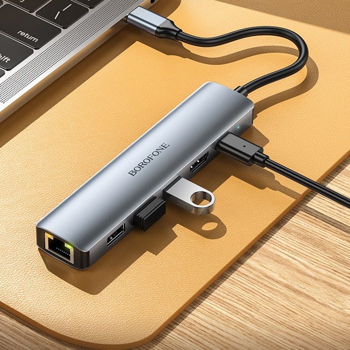 USB-хаб BOROFONE DH16 6-в-1 – це багатофункціональний адаптер, який значно розширює можливості сучасних ноутбуків, планшетів та інших пристроїв із портом Type-C. Він дозволяє підключати до шести різних пристроїв одночасно, включаючи зовнішній монітор, периферійні пристрої, накопичувачі та дротовий інтернет. Пристрій підтримує передачу даних на високій швидкості, відтворення відео у форматі 4K та забезпечує наскрізну зарядку з потужністю до 100 Вт.