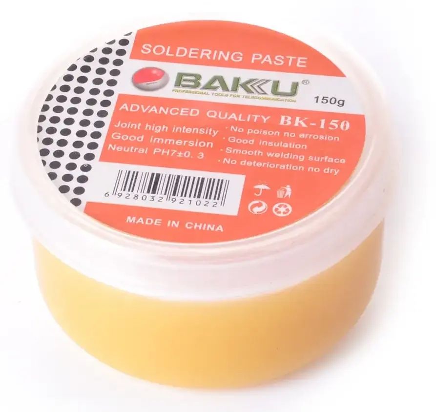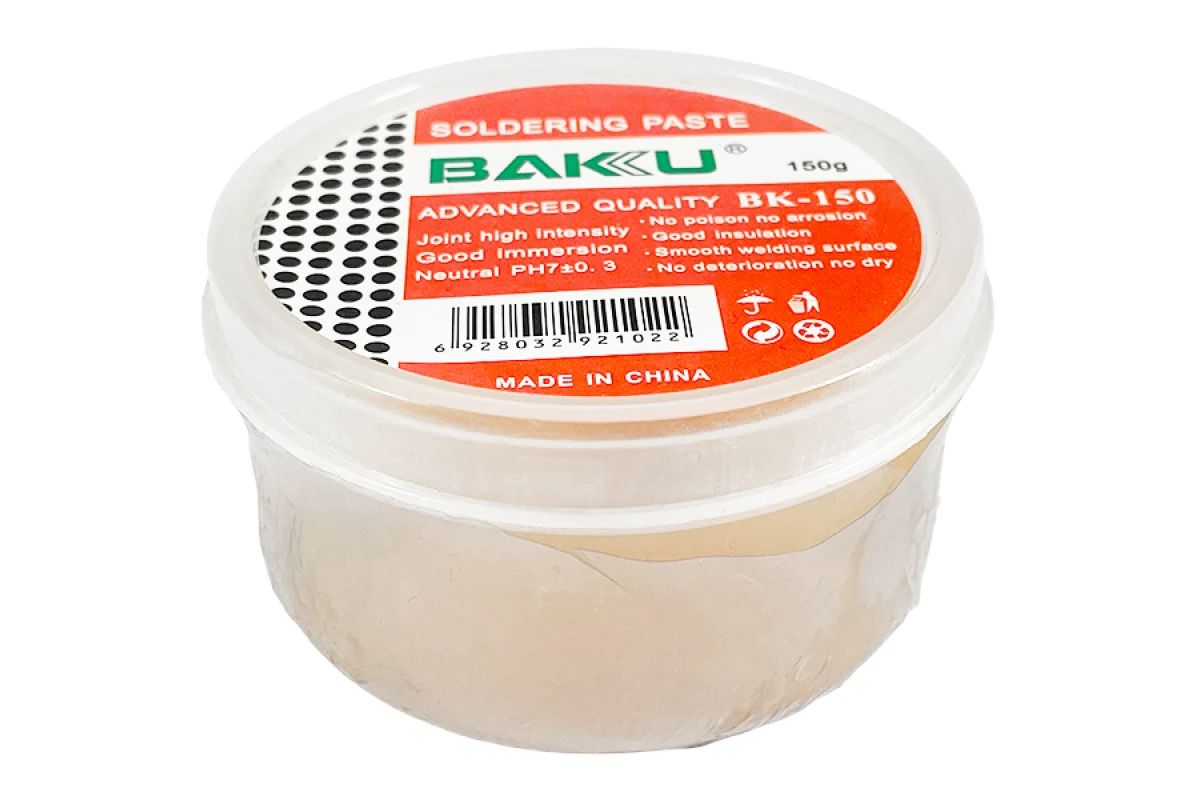 BAKU BK-150 — це каніфольний RMA-флюс без кислот, розроблений для стабільного паяння чутливих електронних компонентів. Забезпечує чисте змочування контактів, стійкий до перегріву та не викликає корозії плат.
