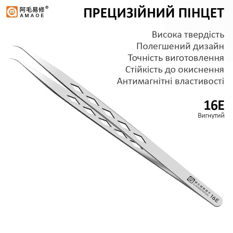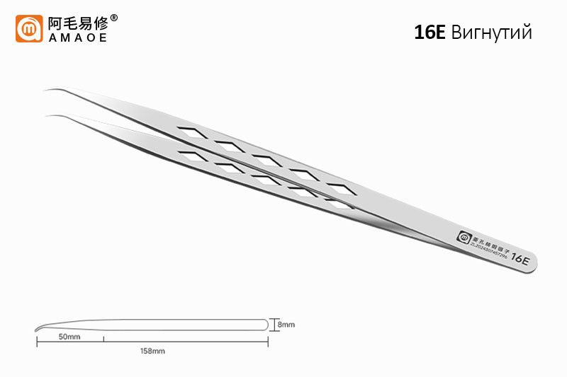 Прецизійний антимагнітний пінцет Amaoe 16E, сталевий, подовжений, вигнутий, 158мм