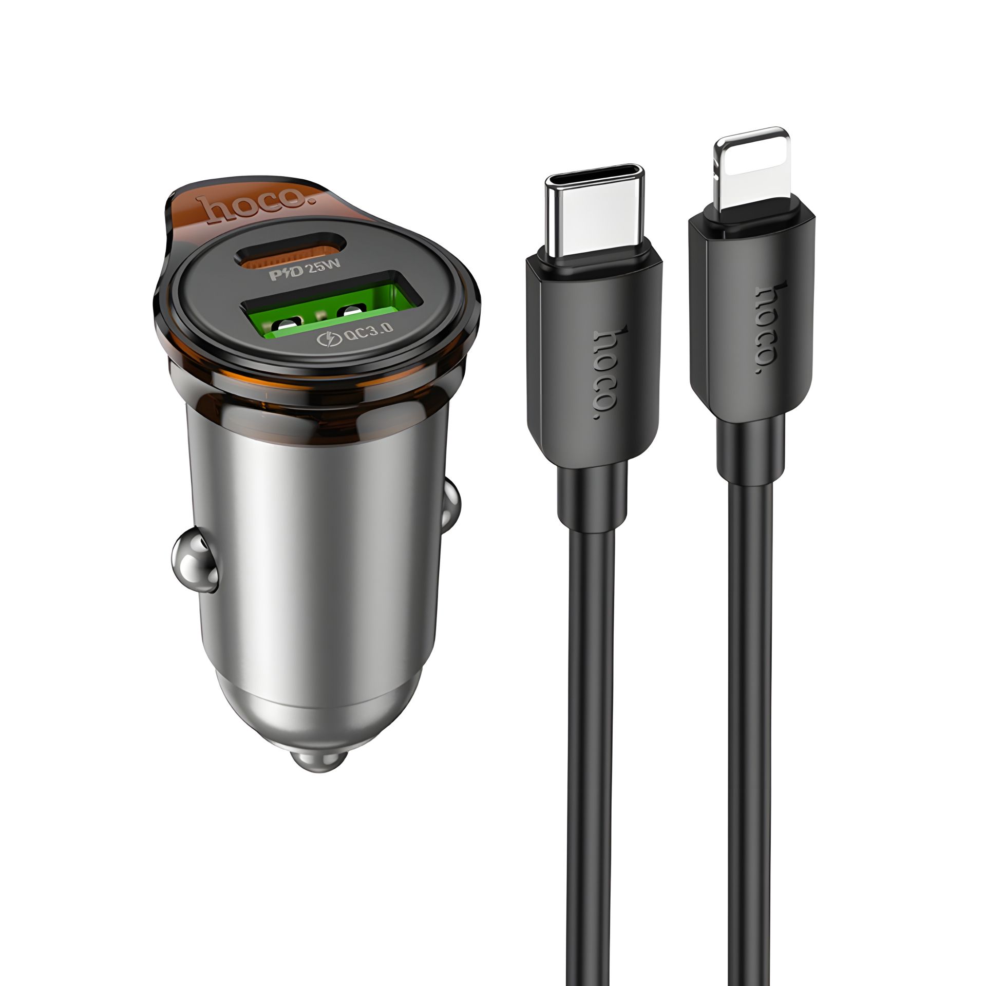Автозарядний пристрій Hoco NZ16A, USB, Type-C, 43W PD, QC 25W, металік сірий, кабель Type-C to Lightning