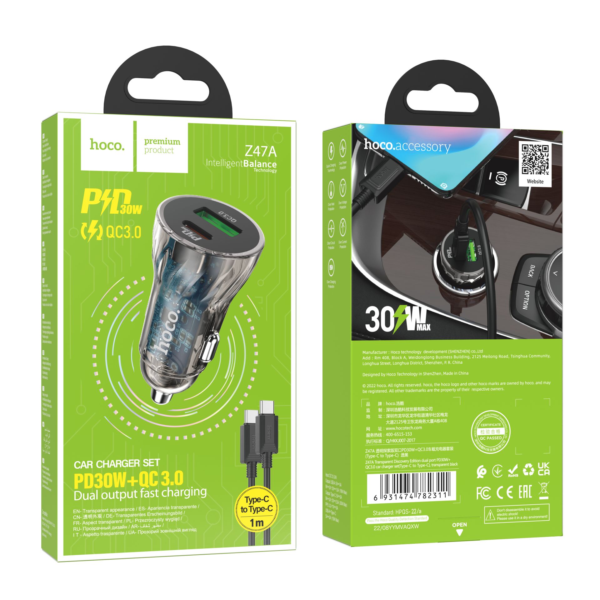 Автомобільний зарядний пристрій Hoco Z47A Transparent, PD30W, QC3.0, кабель Type-C to Type-C, Прозорий чорний
