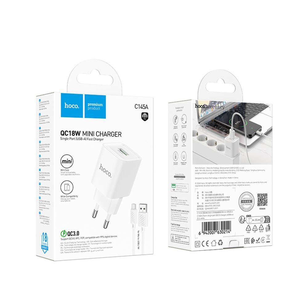 Hoco Мережевий зарядний пристрій C145A, 1USB, QC, 18W, Білий, кабель USB to MicroUSB