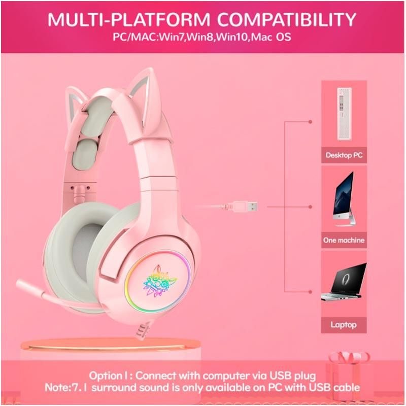 Накладні навушники ONIKUMA Gaming CAT with LED K9 7.1, USB, 2x3.5mm, 2.2m, рожеві
