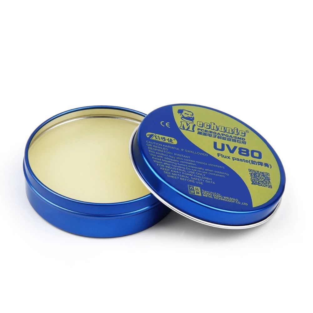 Флюс-паста Mechanic MCN-UV80 – це якісний та безпечний матеріал, призначений для професійного паяння електронних компонентів, друкованих плат, мікросхем, дротів та інших елементів. Вона забезпечує відмінне змочування поверхонь, запобігає утворенню оксидів та сприяє надійному з'єднанню. Завдяки нейтральному хімічному складу та відсутності галогенів флюс не викликає корозії, не ушкоджує елементи та не вимагає обов'язкового промивання.