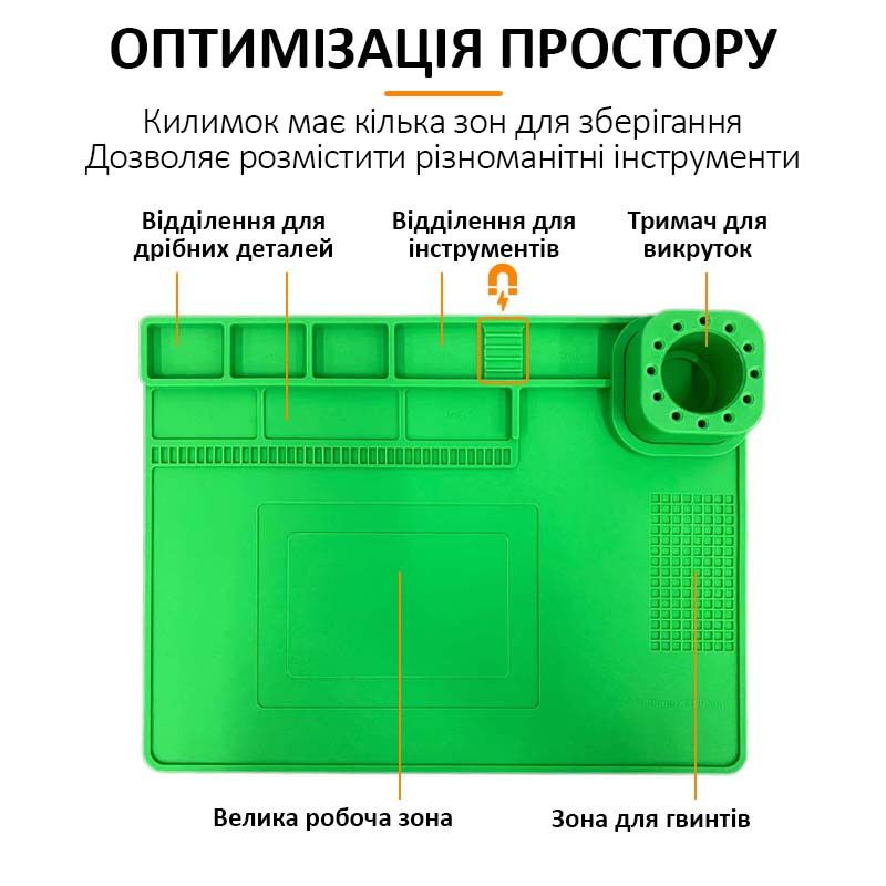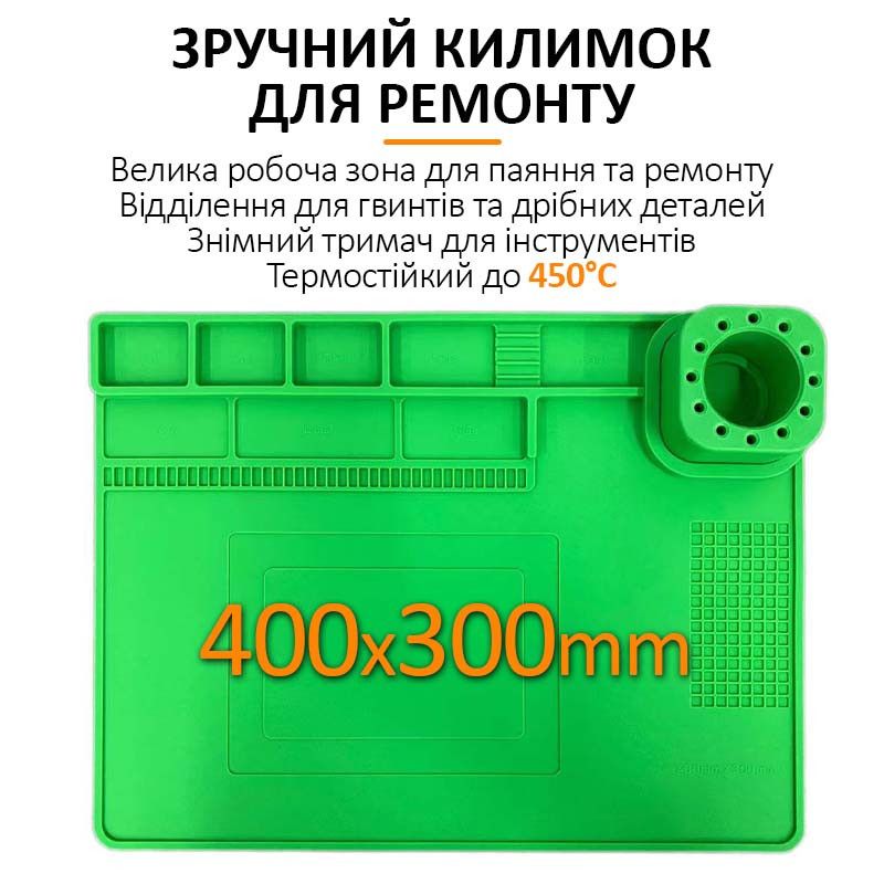 Цей килимок забезпечує безпеку, порядок та довговічність вашого робочого місця, а його ергономічний дизайн робить процес паяння максимально комфортним та акуратним.