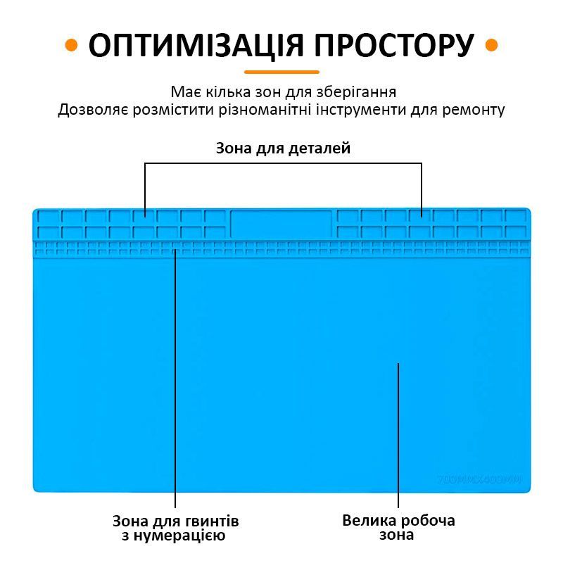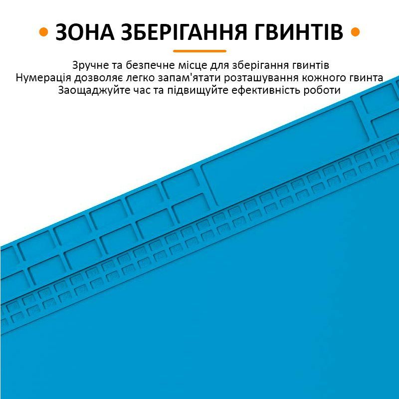 - Поверхня килимка оснащена вбудованими секціями, осередками та заглибленнями, які дозволяють акуратно розміщувати інструменти, гвинти, мікросхеми та інші дрібні компоненти. Це значно підвищує зручність та ефективність роботи, забезпечуючи порядок на робочому місці.