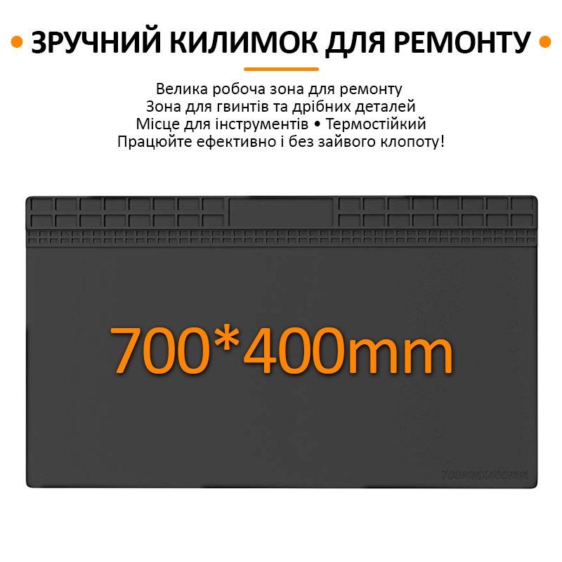 - Виготовлений із якісного термостійкого силікону, килимок здатний витримувати температуру до 500°C, не втрачаючи форму і не плавлячись. Це робить його ідеальним для паяння, демонтажу мікросхем та інших високотемпературних процесів.