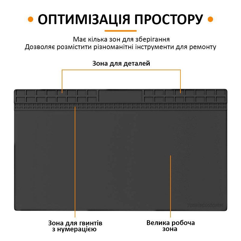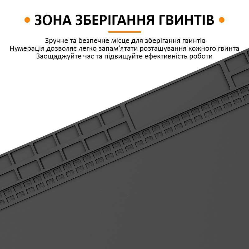 - Поверхня килимка оснащена вбудованими секціями, осередками та заглибленнями, які дозволяють акуратно розміщувати інструменти, гвинти, мікросхеми та інші дрібні компоненти. Це значно підвищує зручність та ефективність роботи, забезпечуючи порядок на робочому місці.