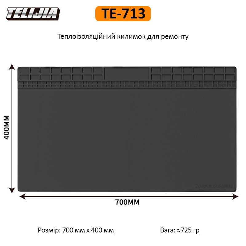 - TELIJIA TE-713 надійно захищає стіл або верстак від механічних пошкоджень, подряпин та слідів від гарячих інструментів. Він запобігає деформації та забруднення робочої зони, зберігаючи її в ідеальному стані навіть при інтенсивному використанні.