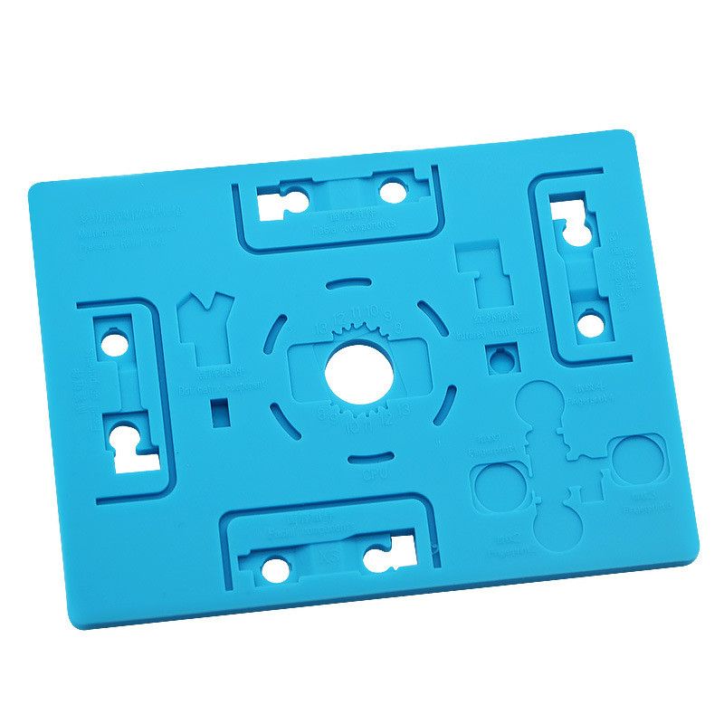 - Килимок оснащений розділами та виїмками, які дозволяють зручно розміщувати мікросхеми, кріплення та дрібні компоненти, забезпечуючи порядок на робочому місці.