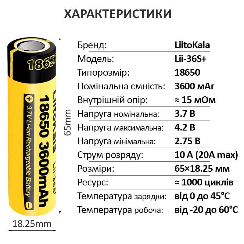 LiitoKala Lii-36S+ — це сучасний літій-іонний акумулятор, створений для стабільної та безпечної роботи в різних пристроях: від ліхтарів і радіомоделей до інструментів і повербанків. Він поєднує високу ємність 3600 мА·год, розрядний струм до 10A і тривалий термін служби до 1000 циклів, що робить його ідеальним рішенням як професійного, так і побутового застосування.