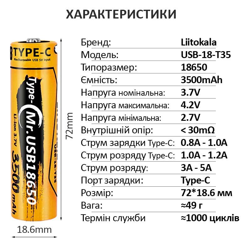 Акумулятор LiitoKala USB-18-T35, 18650, 3500 mAh, Type-C, Origin