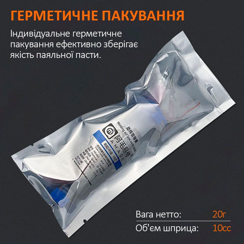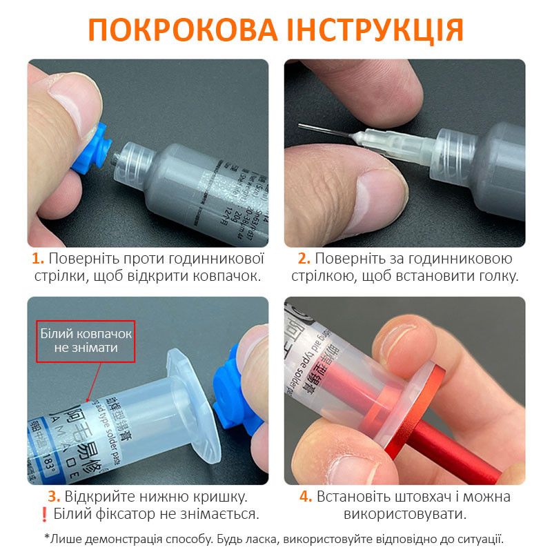- Ця паяльна паста поставляється у зручному шприці 10cc з комплектом голок різного діаметру.