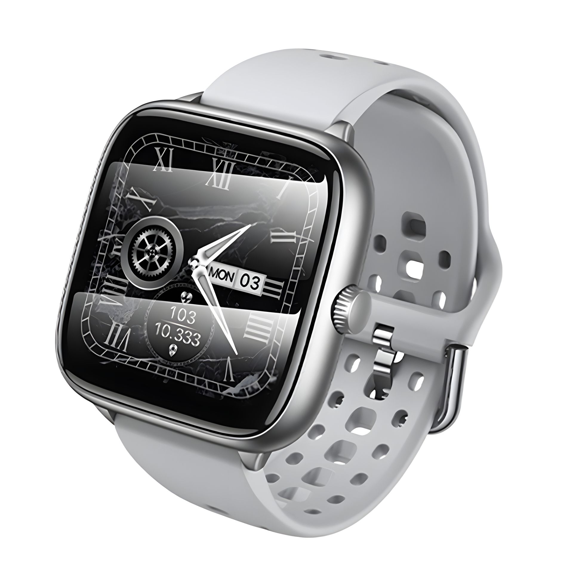 - Сучасний квадратний корпус із закругленими краями та сріблястою рамкою гармонійно поєднується з вентиляційним перфорованим ремінцем – смарт-годинник однаково добре виглядає і зі спортивним, і з повсякденним одягом.