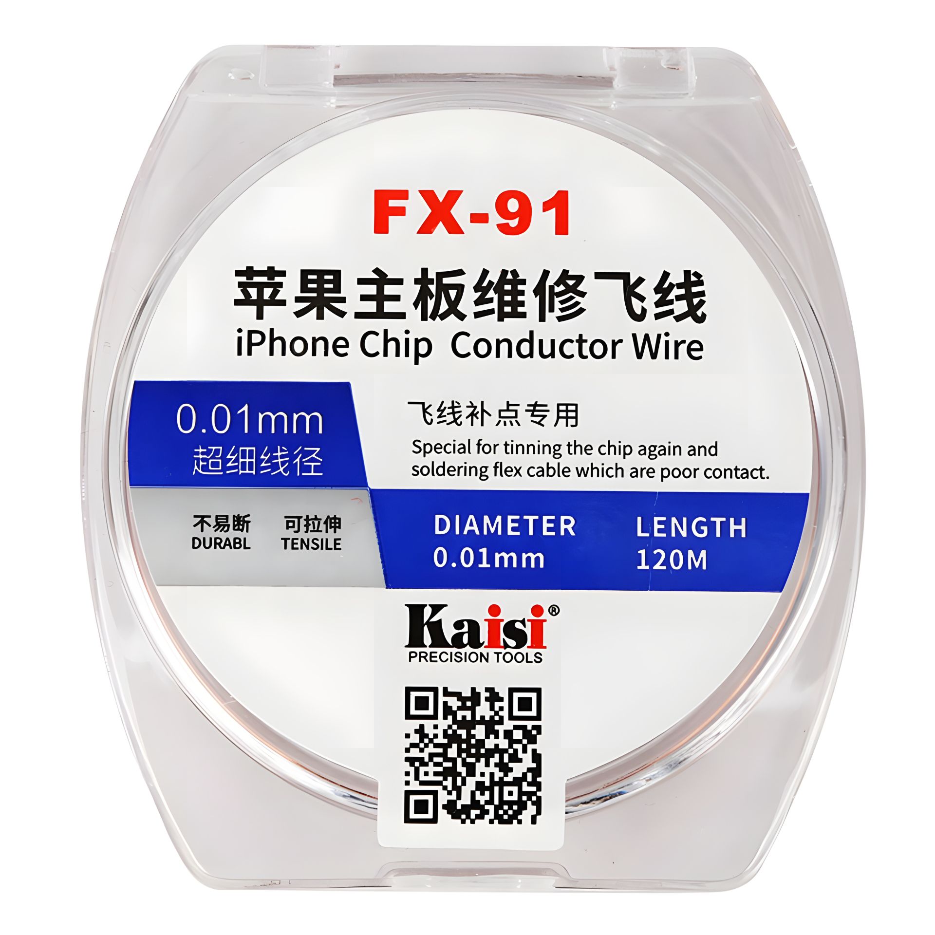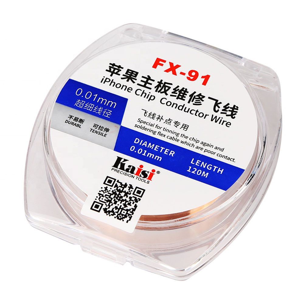 Тонкий дріт Kaisi FX-91, що проводить, призначений для високоточних платних ремонтів — відновлення доріжок, монтажу «fly-line» перемичок, допаювання виводів мікросхем і шлейфів, у тому числі на материнських платах iPhone та іншої сучасної електроніки. Мідна емальована жила діаметром всього 0,01 мм поєднує високу міцність на розрив та еластичність, що дозволяє працювати навіть із сильно завантаженими областями плати без ризику обриву.