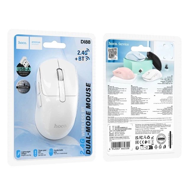 Бездротова миша Hoco DI88 – це компактна та стильна миша з двома режимами підключення, створена для комфортної роботи за ноутбуком, ПК, планшетом чи смартфоном. Завдяки регулюванню чутливості та зручній формі вона однаково добре підходить для офісу, навчання та будинку.