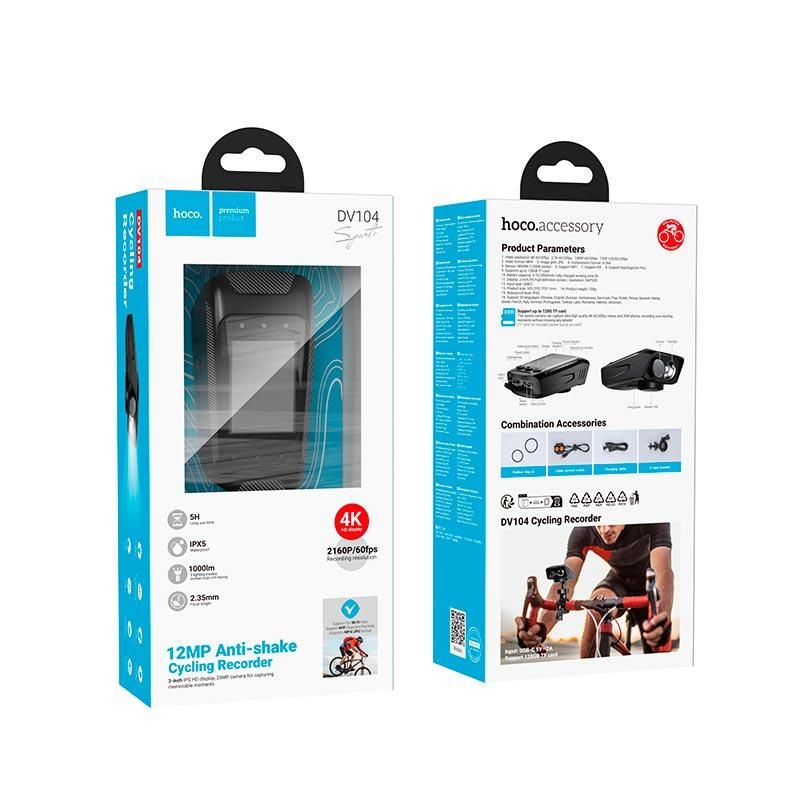 HOCO DV104 — це багатофункціональна екшн-камера для велосипедистів, що об'єднує відеореєстратор надвисокої роздільної здатності та потужну LED-фару. Пристрій призначений для запису поїздок у будь-яких умовах, підвищення безпеки у темний час доби та зручного керування через смартфон. Ця камера підтримує справжню 4K відеозйомку при 60 кадрах в секунду, оснащена електронною стабілізацією зображення та захищена від вологи за стандартом IPX5.