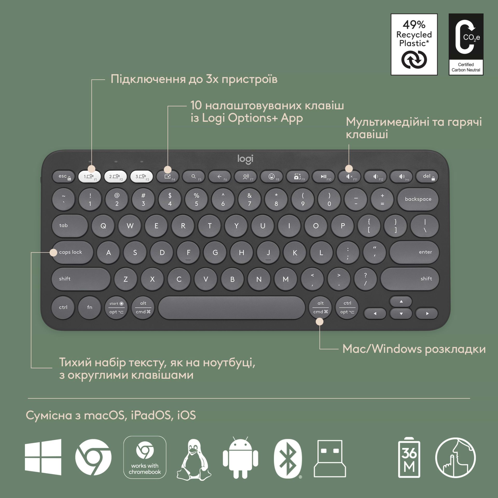 - Комплект працює з Windows, MacOS, iPadOS, iOS, Android, Chrome OS та Linux, що робить його універсальним рішенням для різних платформ.