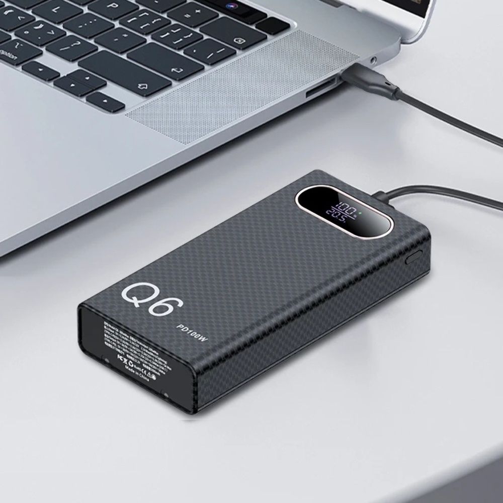 Повербанк Q6 — це потужний зовнішній акумулятор високої ємності, призначений для заряджання ноутбуків, планшетів, смартфонів та іншої портативної електроніки. Пристрій підтримує сучасні протоколи швидкого заряджання з максимальною потужністю до 100 Вт і дозволяє одночасно живити до чотирьох пристроїв. Оснащений цифровим LCD-дисплеєм для точного контролю параметрів роботи та виконаний у міцному корпусі з лаконічним дизайном.