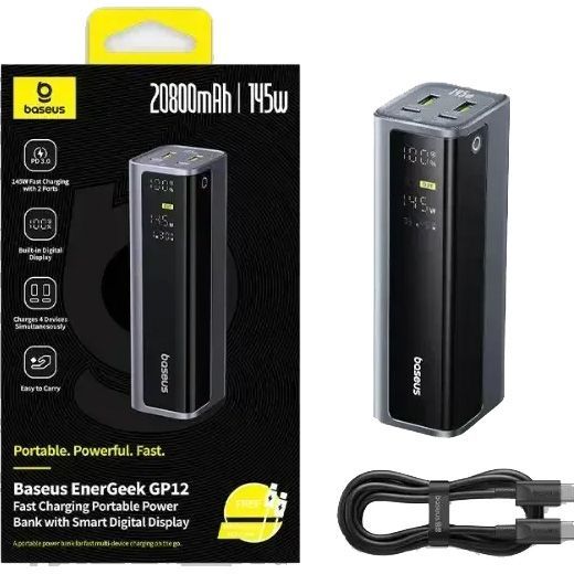 Baseus EnerGeek GP12 — це високопотужний універсальний зовнішній акумулятор, створений для заряджання не тільки смартфонів та планшетів, але й ноутбуків, портативних консолей та іншої енергоємної техніки. Завдяки ємності 20 800 мА·год та максимальній вихідній потужності до 145 Вт, модель відмінно підходить для подорожей, роботи в дорозі та повсякденного використання. Цей пристрій підтримує сучасні стандарти швидкого заряджання, оснащений інтелектуальним цифровим дисплеєм і відповідає вимогам авіаперевезень, що робить його надійним джерелом енергії в будь-яких умовах.