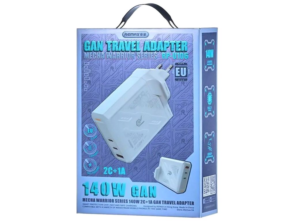 Remax RP-U106 - потужний універсальний адаптер, призначений для швидкої та безпечної зарядки ноутбуків, смартфонів, планшетів та іншої портативної електроніки. Модель побудована на основі сучасних напівпровідників нітриду галію (GaN), що забезпечує компактні розміри, високу енергоефективність і стабільну роботу без перегріву навіть при максимальному навантаженні.