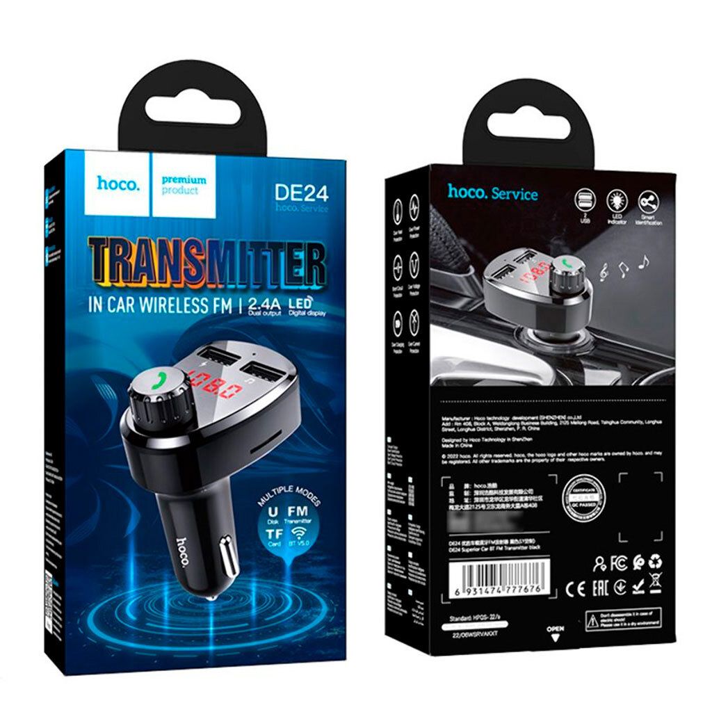 FM-модулятор Hoco DE24 - багатофункціональний автомобільний пристрій, що поєднує в собі FM-трансмітер, Bluetooth-адаптер, музичний плеєр і автомобільний зарядний пристрій. Модель призначена для комфортної передачі аудіосигналу на штатну аудіосистему автомобіля, а також для одночасної зарядки мобільних пристроїв під час подорожі.