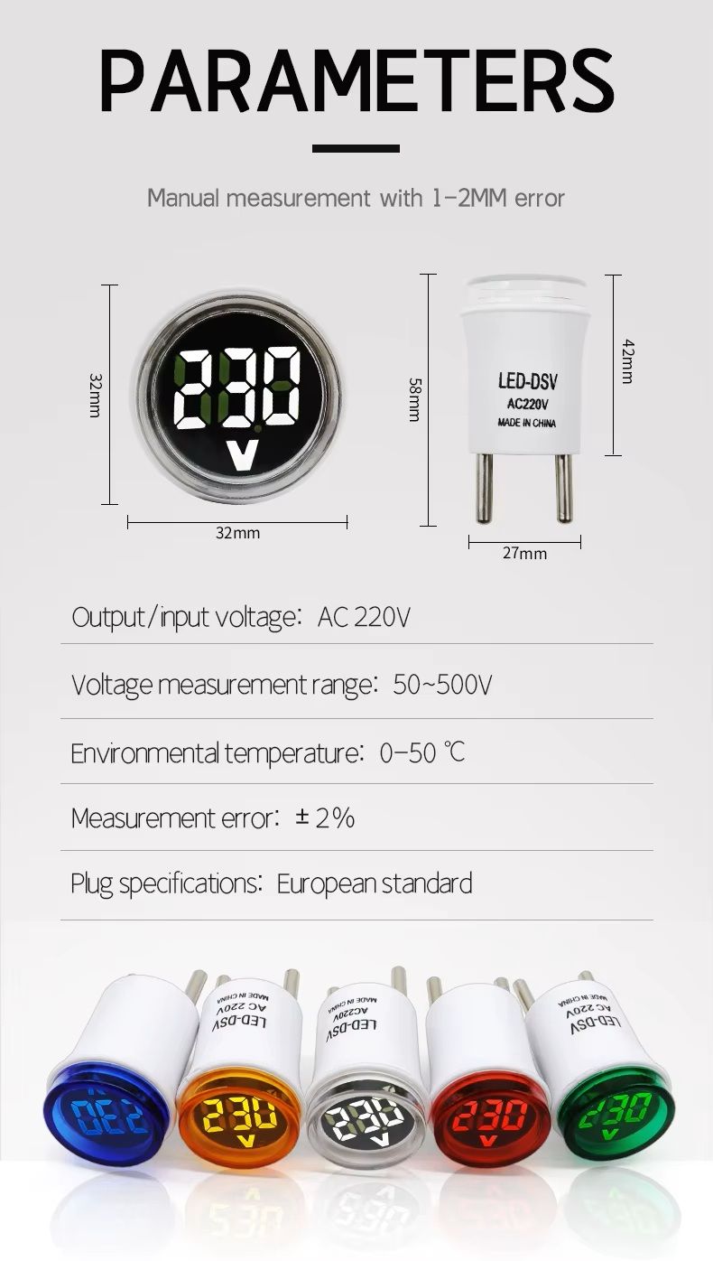 Компактний цифровий вольтметр із LED-індикатором призначений для швидкого та наочного контролю напруги в мережі змінного струму. Пристрій виконаний у форматі європейської вилки і працює за принципом «встав і дивися», не вимагаючи налаштування або додаткового живлення. Підходить для побутового та промислового застосування, а також для сервісних та діагностичних завдань.