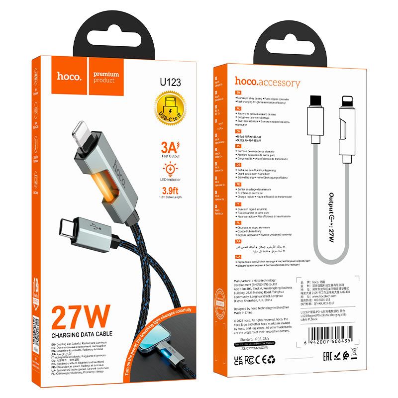 Кабель Hoco U123 Type-C to Lightning – це високоякісний аксесуар для заряджання та передачі даних пристроїв Apple. Ця модель підтримує швидке заряджання Power Delivery з потужністю до 27W, забезпечуючи ефективне живлення iPhone, iPad та інших сумісних гаджетів. Міцна нейлонова оплетка, надійні алюмінієві з'єднання та функціональні особливості роблять кабель довговічним та зручним для повсякденного використання.