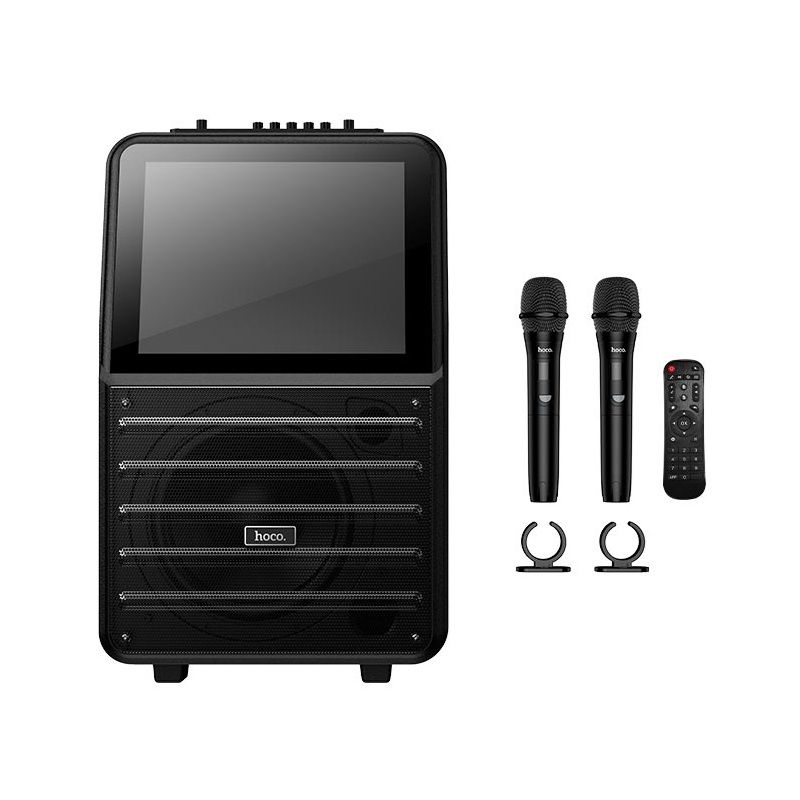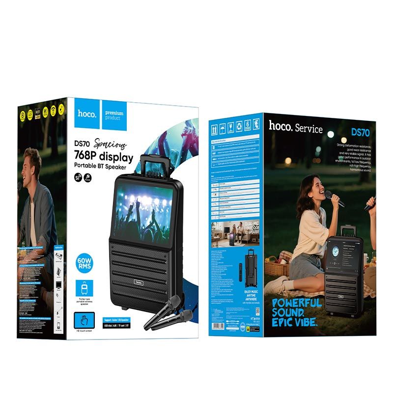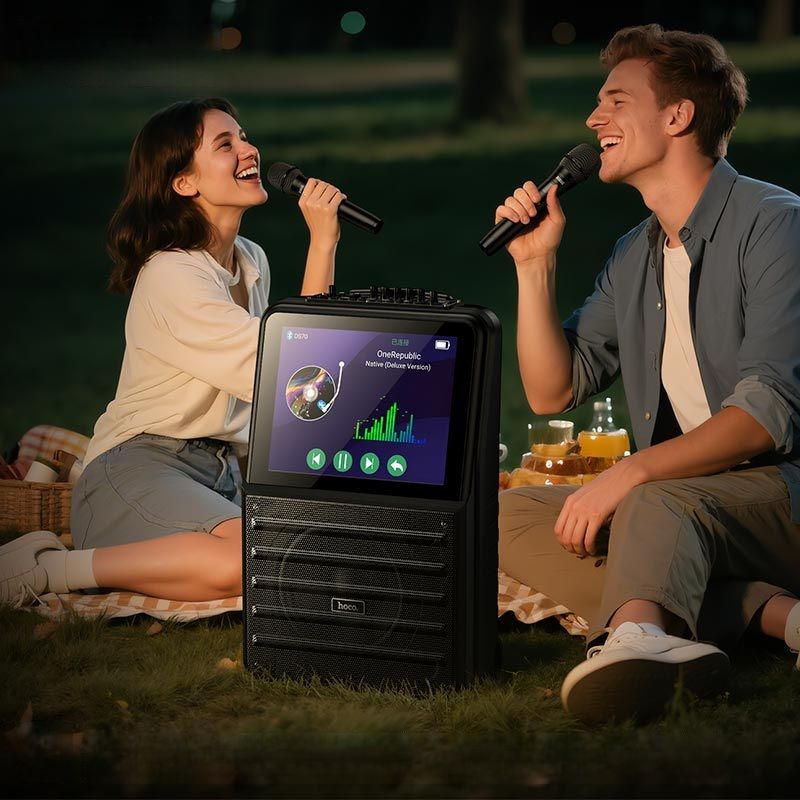 Портативна караоке-система HOCO DS70 – це повноцінний мультимедійний центр для вечірок, свят, презентацій, шкільних заходів та домашнього використання. Модель поєднує потужну акустику 60 Вт, великий сенсорний дисплей 14.1″ з роздільною здатністю 1024×768 (768p), вбудовану платформу Android і комплект з двох бездротових мікрофонів. Система повністю готова до роботи відразу після розпакування і не вимагає підключення додаткових пристроїв для запуску караоке.